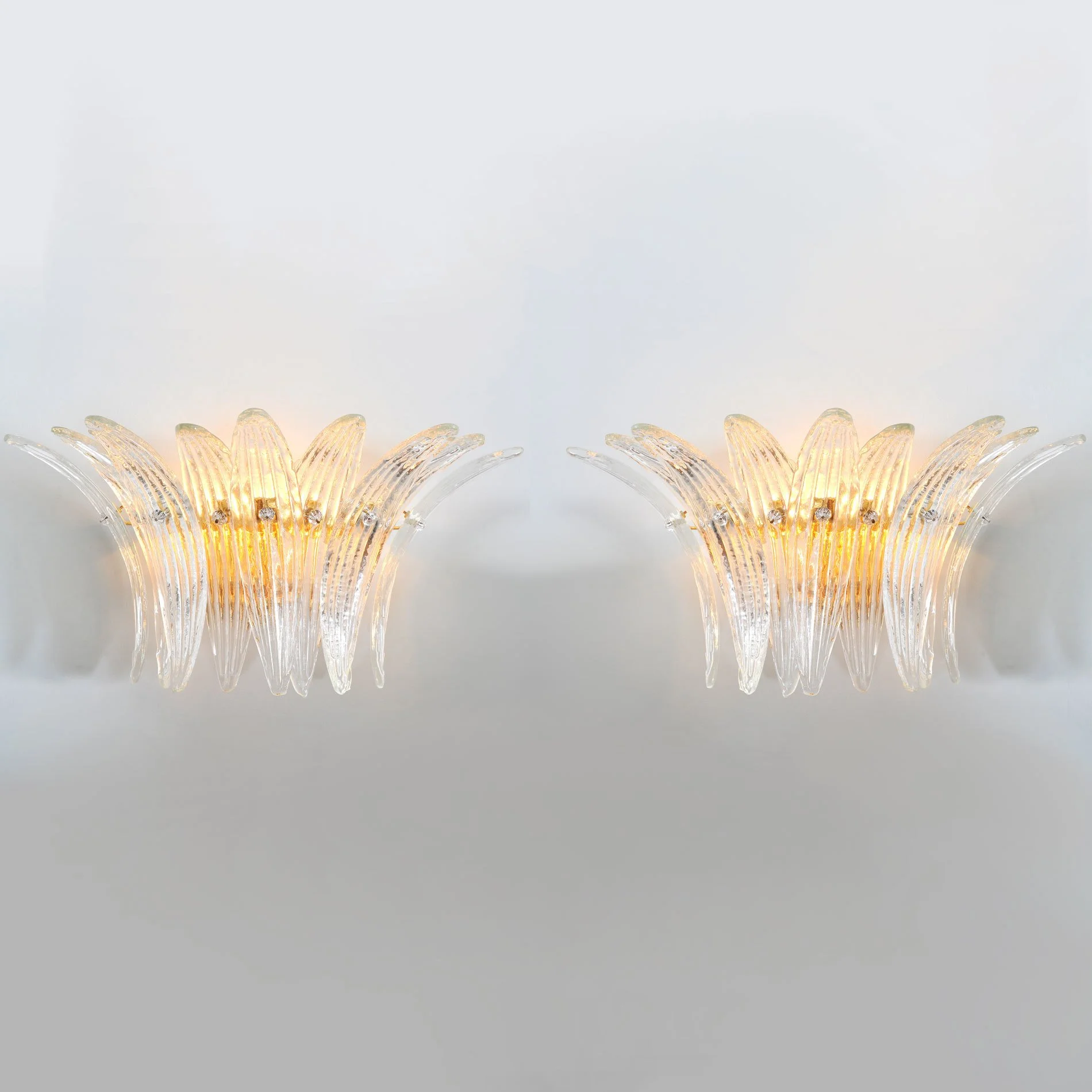 Italian wall light with 9 hand blown clear Murano glass leaves in the style of Barovier mounted on gold finish metal frame / Made in Italy