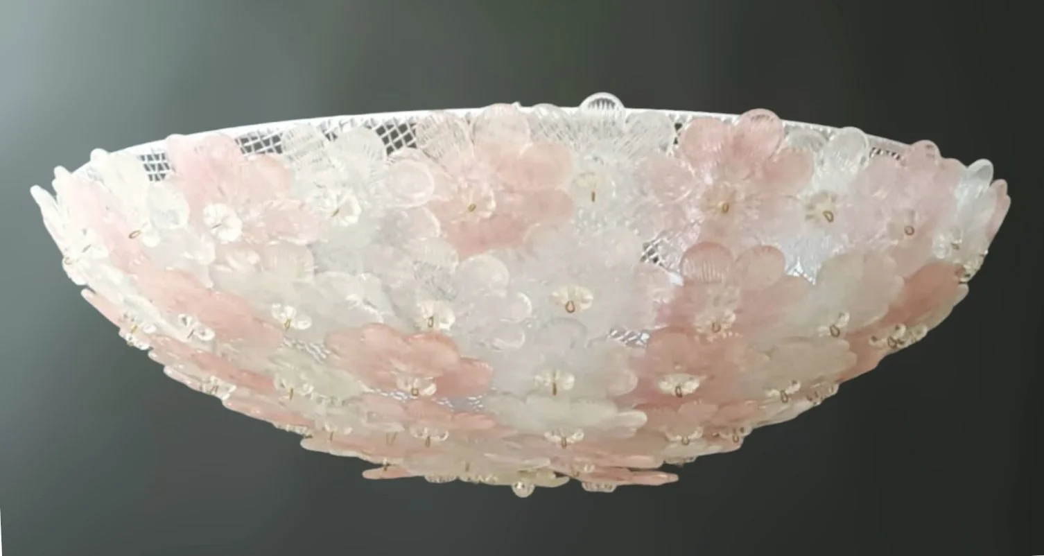 Vintage Italian flush mount with clear and pink hand blown Murano glass flowers / Made in Italy in the 1960s by Barovier e Toso