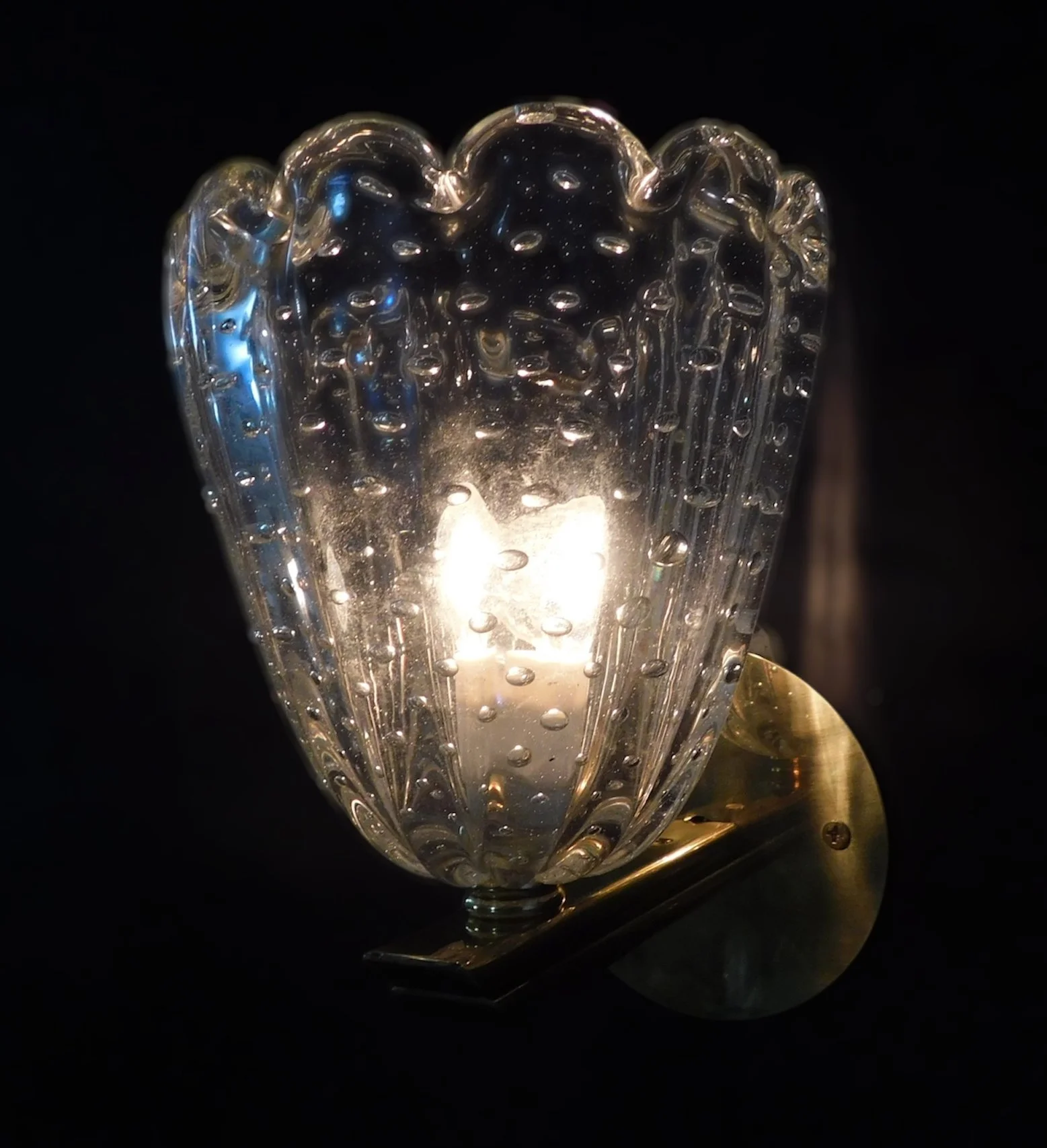 Vintage Italian wall lights with clear Murano glass cups hand blown with bubbles inside the glass using Bollicine technique, mounted on brass frames / Made in Italy, circa 1950s
